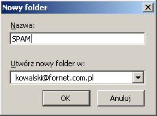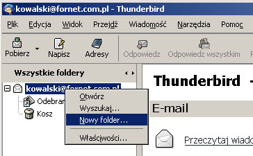 Krokiem pierwszym jest stworzenie folderu do którego trafiac będzie nasza niechciana poczta. W tym celu klikamy prawym klawiszem myszy na nazwę konta i wybieramy opcję nowy folder.