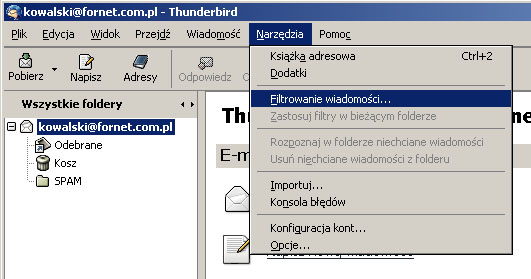 Aby w programie Mozilla Thunderbird stworzyć filtr należy z menu wybrać opcję Narzędzia -> Filtrowanie wiadomości...