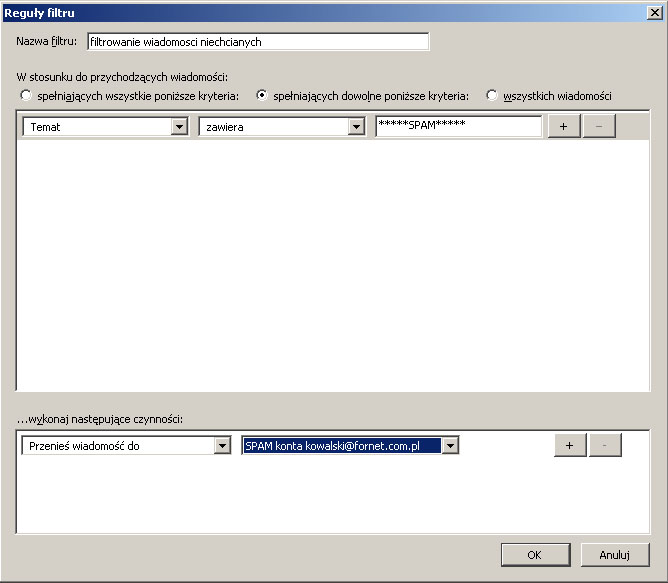 Po wybraniu tej opcji pojawi się okno w którym definiujemy zachowanie filtra. Patrząc od góry najpierw wpisujemy przyjazną nazwę filtra po której identyfikować będziemy go. Nastepnie w polu poniżej mamy opcje pozwalającą na określenie czy nasze wiadomości mają spełniać wszystkie stworzone przez nas kryteria czy dowolne. W naszym przypadku nie ma to znaczenia gdyż tworzymy tylko jedno kryterium według którego będziemy oddziaływać na wiadomości. W polu poniżej wybieramy że nasze kryterium ma sprawdzać temat wiadomości w którym zawiera się ciąg znaków *****SPAM*****. Na samym dole okna, definiujemy co ma się stać z wiadomością która spełnia powyższe kryterium. Z listy czynności wybieramy "Przenieść wiadomość do" oraz z pola obok wybieramy folder do którego ma trafić wiadomość. Oczywiście zarówno kryteriów jak i czynności może być więcej ale na nasze potrzeby parametry które podaliśmy są wystarczające. Zatwierdzamy wszystko przyciskiej "OK".